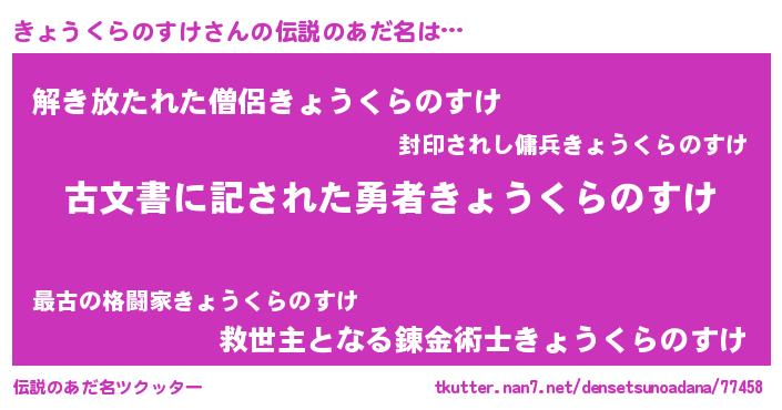 | 男性向けラノベタイトル風あだ名 | 『誰もが恐れるあのきょうくらのすけが、ぼくの専属メイドになるようです。』 |