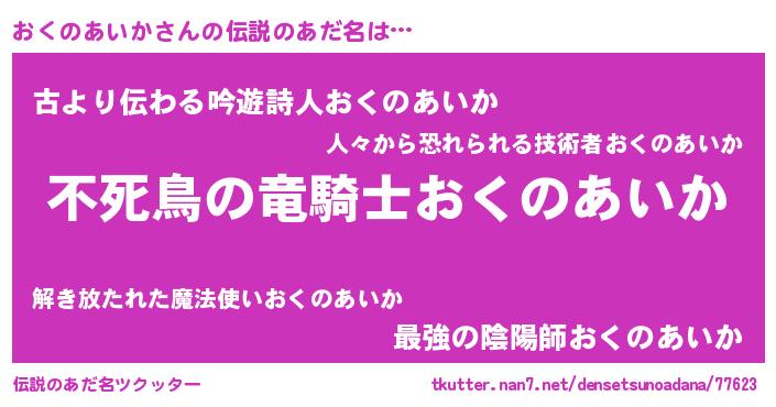 | 女子向けラノベタイトル風あだ名 | 『おくのあいか姫と円卓の騎士』 |