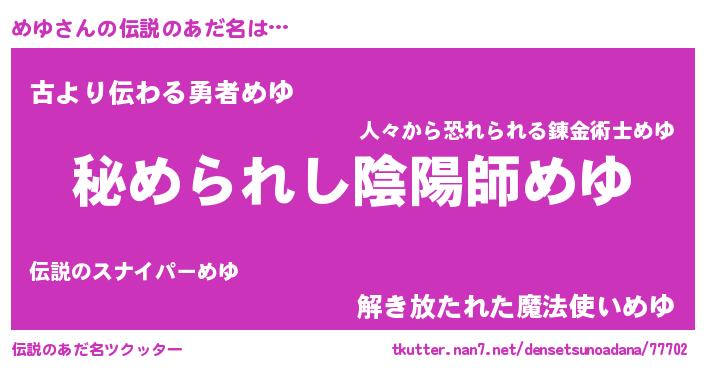 | 男性向けラノベタイトル風あだ名 | 『魔弾の王とめゆ』 |
