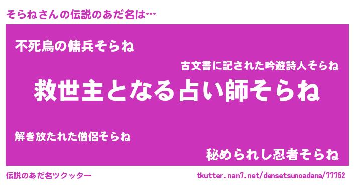 | 男性向けラノベタイトル風あだ名 | 『Re:そらねから始める異世界生活』 |