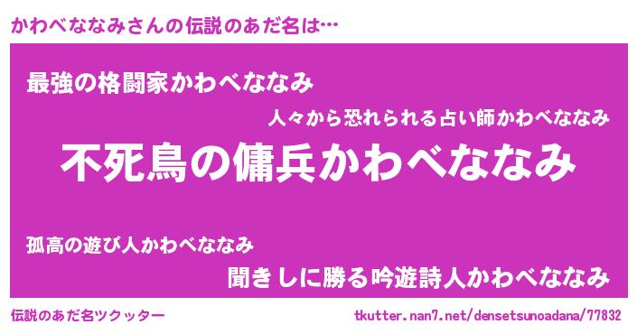 | 女子向けラノベタイトル風あだ名 | 『かわべななみ姫と円卓の騎士』 |