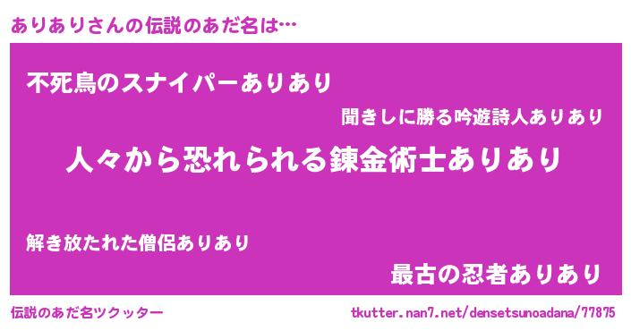 | 男性向けラノベタイトル風あだ名 | 『おまえをオタクにしてやるから、俺をありありにしてくれ! 』 |