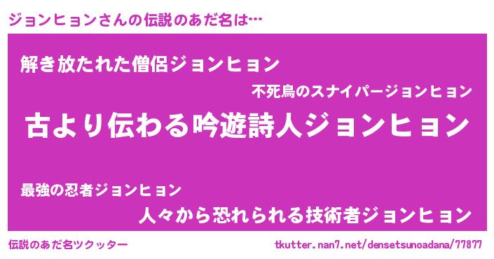 女子向けラノベタイトル風あだ名 | 『乙女ゲームの破滅フラグしかない悪役ジョンヒョンに転生してしまった…』 |