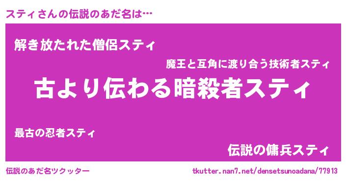 | 男性向けラノベタイトル風あだ名 | 『転生したらスティだった件』 |