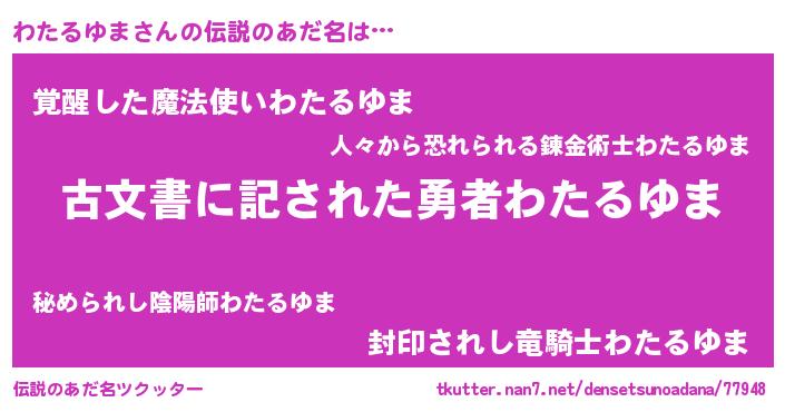 | 男性向けラノベタイトル風あだ名 | 『わたるゆま~年齢イコール彼女いない歴の魔法使い~』 |
