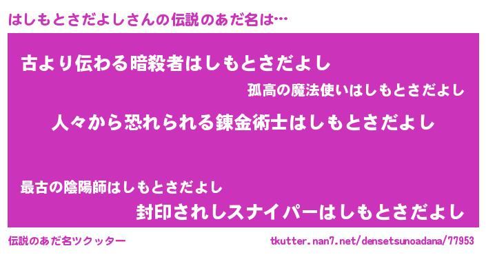 | 男性向けラノベタイトル風あだ名 | 『おまえをオタクにしてやるから、俺をはしもとさだよしにしてくれ! 』 |