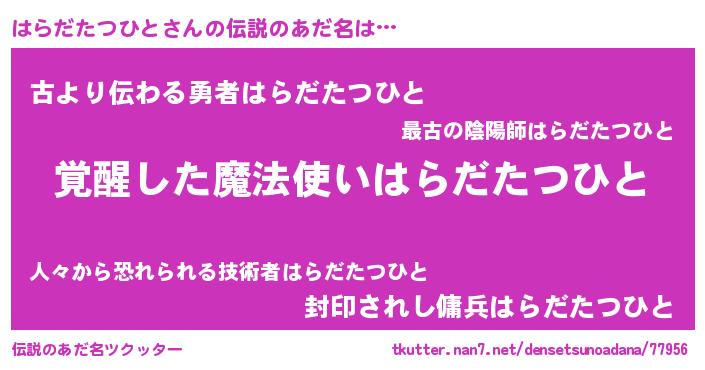 | ヒーロー風カッコイイあだ名 | 『炎刃騎士ハラ』『ネオハラダタツヒト』 |