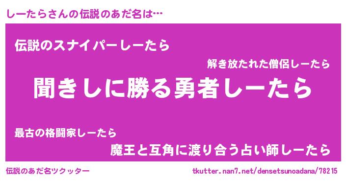 | 男性向けラノベタイトル風あだ名 | 『しーたらという概念が存在しない退屈な世界 』 |