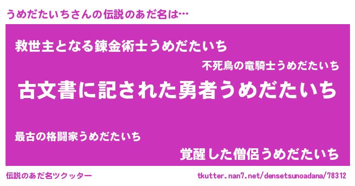 | 男性向けラノベタイトル風あだ名 | 『うめだたいちに滅ぼされるだけの簡単なお仕事です』 |