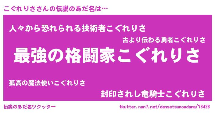 | 男性向けラノベタイトル風あだ名 | 『こぐれりさに滅ぼされるだけの簡単なお仕事です』 |