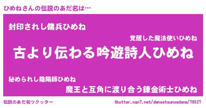 | 男性向けラノベタイトル風あだ名 | 『ひめねという概念が存在しない退屈な世界 』 |