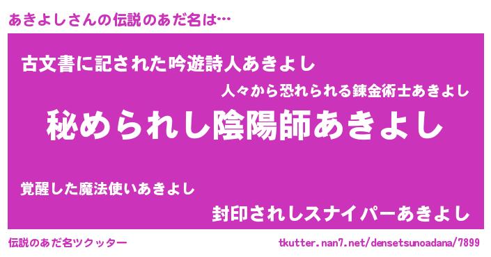 | 男性向けラノベタイトル風あだ名 | 『アキヨシスレイヤー』 |
