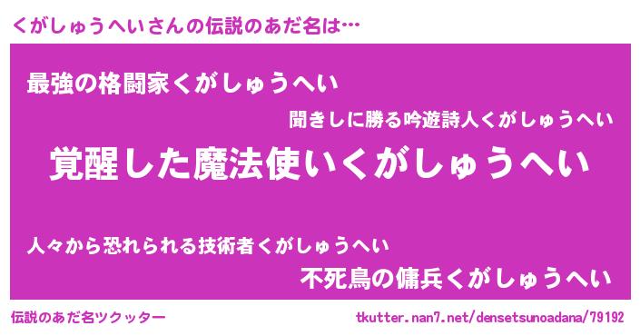 | 男性向けラノベタイトル風あだ名 | 『くがしゅうへいの嫁は女の子じゃないと思った?』 |