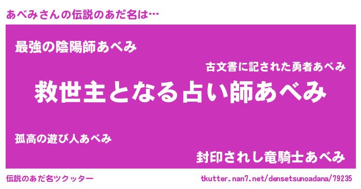 | ヒーロー風カッコイイあだ名 | 『慈愛の使者あべみ』『スーパーアベミ』 |