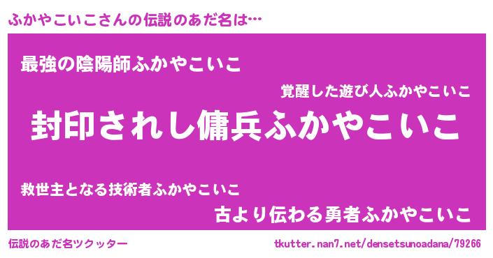 | ヒーロー風カッコイイあだ名 | 『スーパーフカヤコイコ』『魔戒騎士フカ』 |