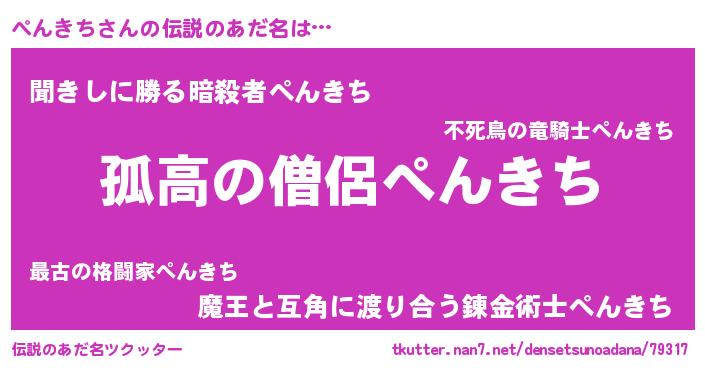 | 男性向けラノベタイトル風あだ名 | 『ダンジョンにぺんきちを求めるのは間違っているだろうか』 |
