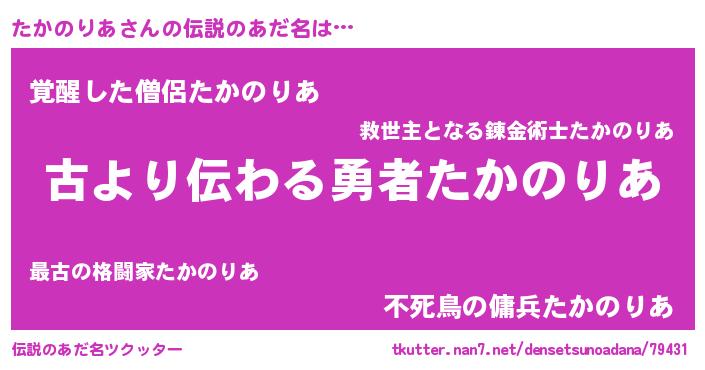 | ヒーロー風カッコイイあだ名 | 『ネオタカノリア』『炎刃騎士タカ』 |