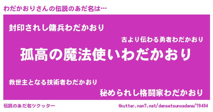 | 女子向けラノベタイトル風あだ名 | 『わだかおりなんてお断りですっ。』 |