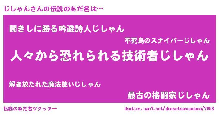 | 意味不明あだ名 | 『自称じしゃん』『永久保存じしゃん』 |
