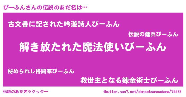 | 女子向けラノベタイトル風あだ名 | 『びーふんの卵を拾いまして』 |