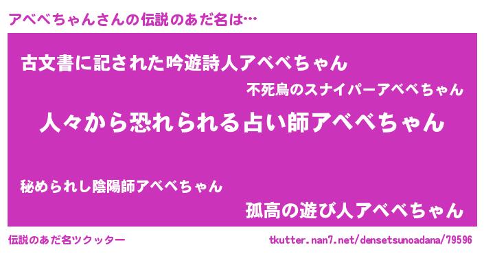 | 女子向けラノベタイトル風あだ名 | 『アベベちゃん夫妻のなれそめ』 |