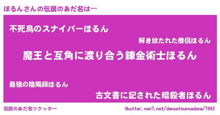 | 女子向けラノベタイトル風あだ名 | 『ほるん恋絵巻』『ほるんの契約王妃』 |