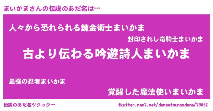 | 意味不明あだ名 | 『永久保存まいかま』『自称まいかま』 |