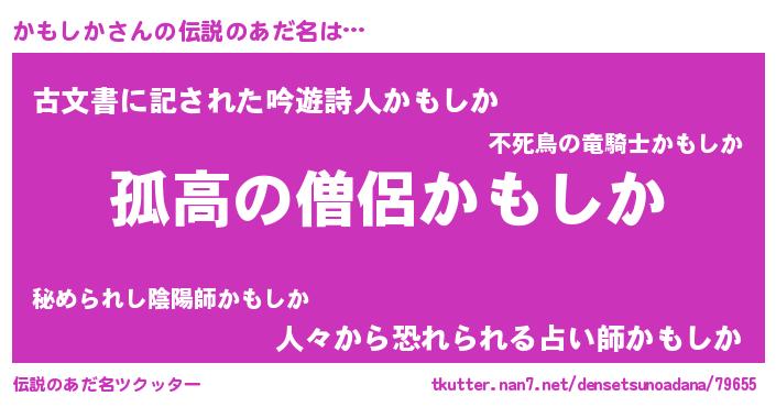 | 男性向けラノベタイトル風あだ名 | 『魔弾の王とかもしか』 |