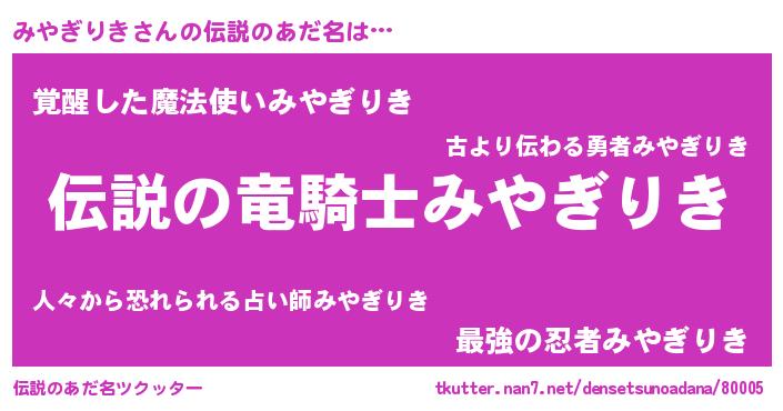 | ヒーロー風カッコイイあだ名 | 『スーパーミヤギリキ』『仮面ミヤダー』 |