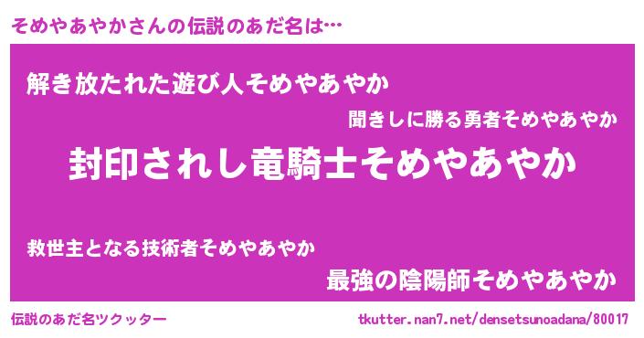 | ヒーロー風カッコイイあだ名 | 『スーパーソメヤアヤカ』『天弓騎士ソメ』 |