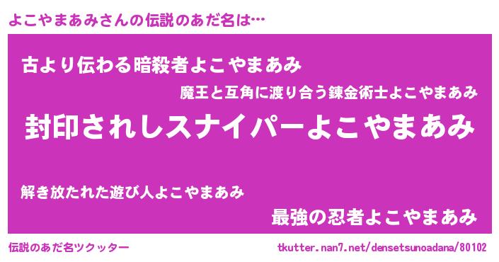| 男性向けラノベタイトル風あだ名 | 『うちのよこやまあみが世界を掌握している!』 |