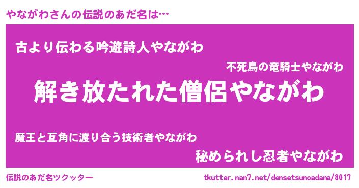 | 男性向けラノベタイトル風あだ名 | 『やながわの嫁は女の子じゃないと思った?』 |