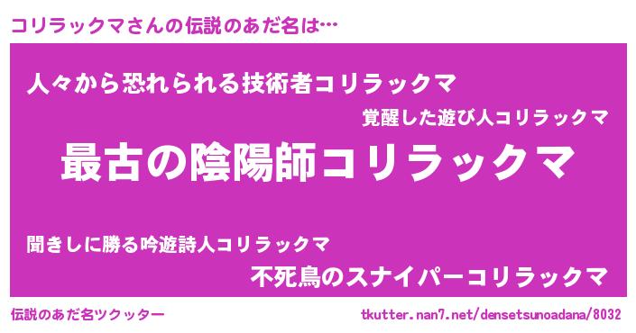 | 男性向けラノベタイトル風あだ名 | 『転生したらコリラックマだった件』 |