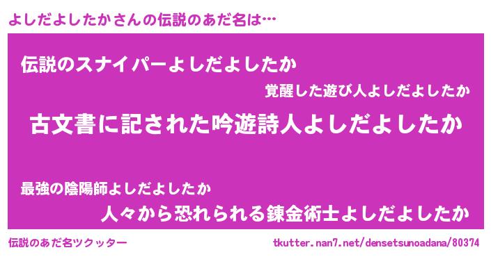| 女子向けラノベタイトル風あだ名 | 『悪役よしだよしたかに転生したようですが、知った事ではありません』 |