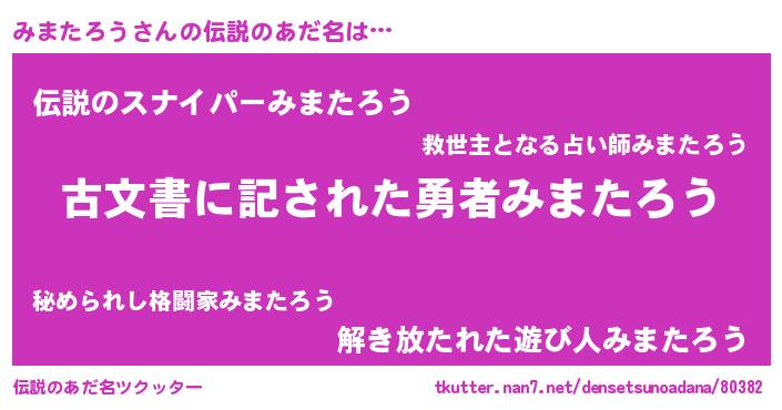 | 男性向けラノベタイトル風あだ名 | 『みまたろう~年齢イコール彼女いない歴の魔法使い~』 |