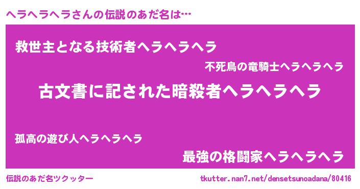 | 男性向けラノベタイトル風あだ名 | 『Re:ヘラヘラヘラから始める異世界生活』 |
