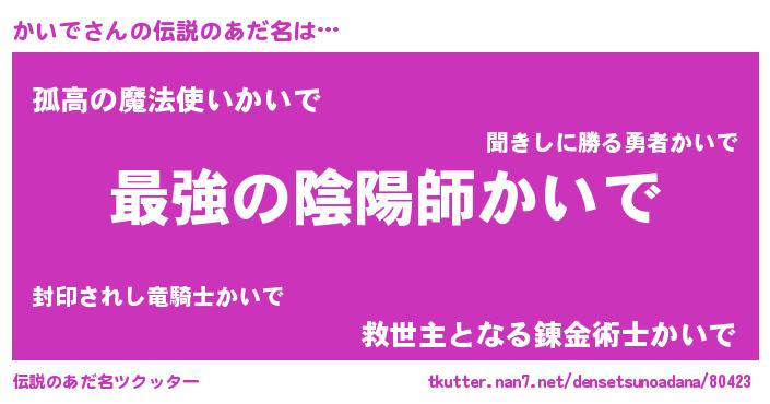 | 男性向けラノベタイトル風あだ名 | 『かいで~年齢イコール彼女いない歴の魔法使い~』 |