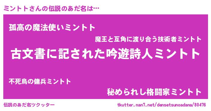 | ヒーロー風カッコイイあだ名 | 『ネオミントト』『魔戒騎士ミン』 |