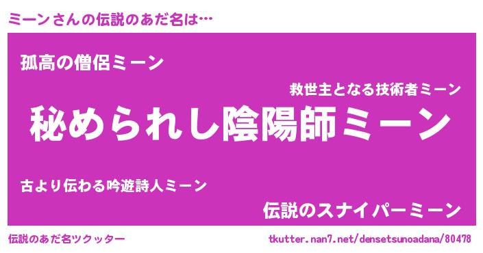 | 女子向けラノベタイトル風あだ名 | 『ミーンの雑貨屋さん』『ミーン恋絵巻』 |