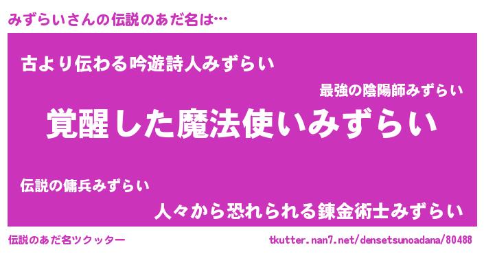 | 男性向けラノベタイトル風あだ名 | 『みずらい~年齢イコール彼女いない歴の魔法使い~』 |