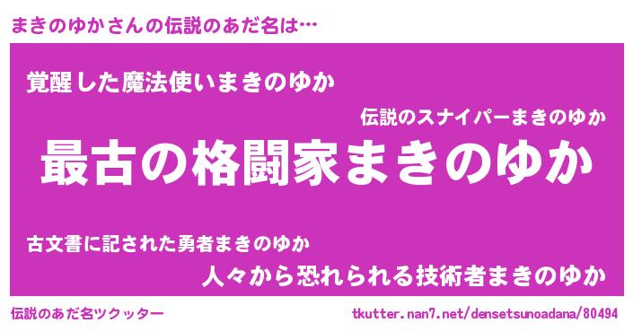 | 肩書あだ名 | 『まきのゆか総理大臣』『まきのゆか中将』 |