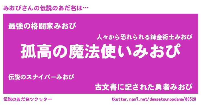 | 女子向けラノベタイトル風あだ名 | 『みおぴは平凡を望む』『みおぴの婚約者』 |