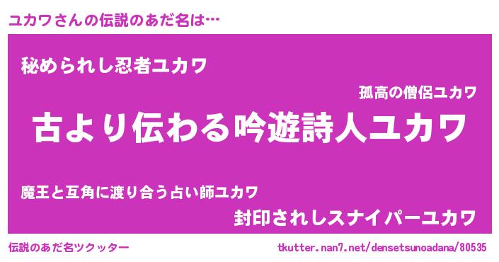 | 意味不明あだ名 | 『永久保存ユカワ』『めかぶ科ユカワ属』 |
