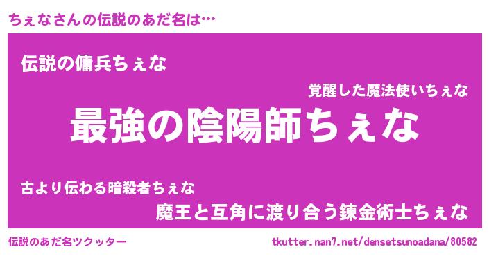 | 男性向けラノベタイトル風あだ名 | 『うちのちぇなが世界を掌握している!』 |