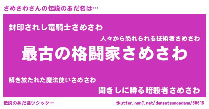 | 意味不明あだ名 | 『たけのこ科さめさわ属』『自称さめさわ』 |