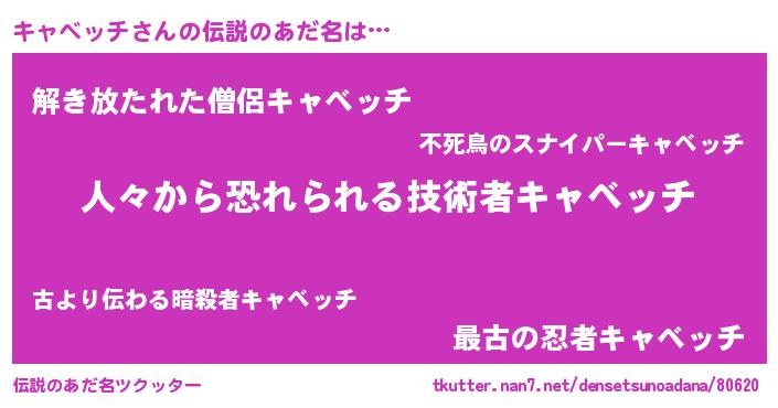 | 男性向けラノベタイトル風あだ名 | 『おまえをオタクにしてやるから、俺をキャベッチにしてくれ! 』 |