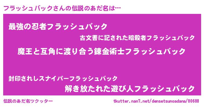 | 男性向けラノベタイトル風あだ名 | 『おまえをオタクにしてやるから、俺をフラッシュバックにしてくれ! 』 |
