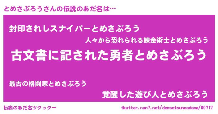 | ヒーロー風カッコイイあだ名 | 『ネオトメサブロウ』『炎刃騎士トメ』 |