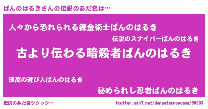 | 胡散臭い通販商品みたいなあだ名 | 『来世でも幸せになれる健康食品…その名も「ばんのはるき」』 |