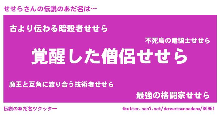 | 意味不明あだ名 | 『とにかく怪しいせせら』『自称せせら』 |